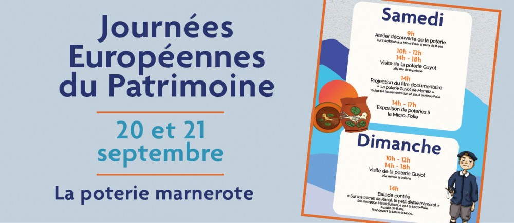 RDV les 20 et 21 septembre pour les journées européennes du patrimoine. PROGRAMME : - Atelier pratique de découverte de l'art de la poterie samedi 20 septembre à 9h à la Micro-Folie (pour adultes, sur inscription) - Visites de l'ancienne poterie Guyot en présence de Bernard Coronel (dernier potier de la ville), les 2 jours de 10h à 12h et de 14h à 18h. - Diffusion du film documentaire "la poterie Guyot de Marnaz" à la Micro-Folie, samedi, de 14h à 17h (diffusion toutes les heures) - Balade contée sur les traces de "Raoul le petit diable marnerot" jeu pour enfant, dimanche à 14h devant la mairie (inscriptions auprès de la bibliothèque ou de la Micro-Folie) |